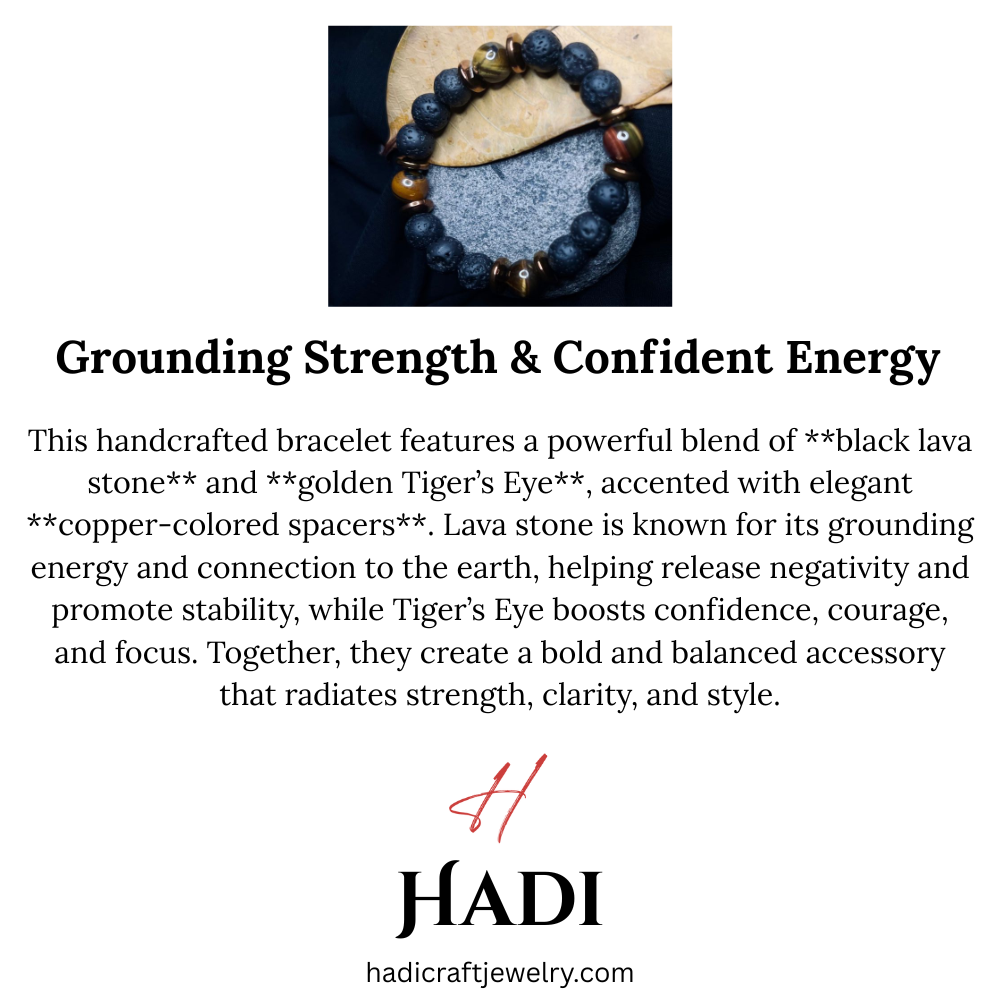 Elevate your style and energy with this handcrafted **Black Lava & Tiger Eye Stone Bracelet**, designed for both men and women. The **black lava beads** offer natural grounding energy, helping you stay balanced and connected to the earth, while **golden Tiger’s Eye stones** enhance courage, focus, and self-confidence. Finished with **copper-colored spacers**, this bracelet blends earthy elegance with powerful crystal healing benefits.
