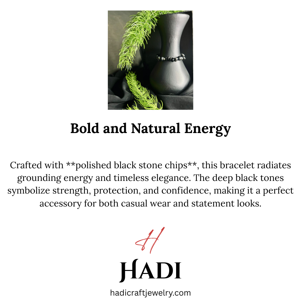 This handcrafted bracelet is made with glossy black polished stone chips, giving it a sleek and bold appearance. Each stone chip is unique in shape, adding natural texture and style to the design. Measuring **7.25 inches (18.4 cm)**, this regular standard size fits comfortably for most wrists in the USA market.